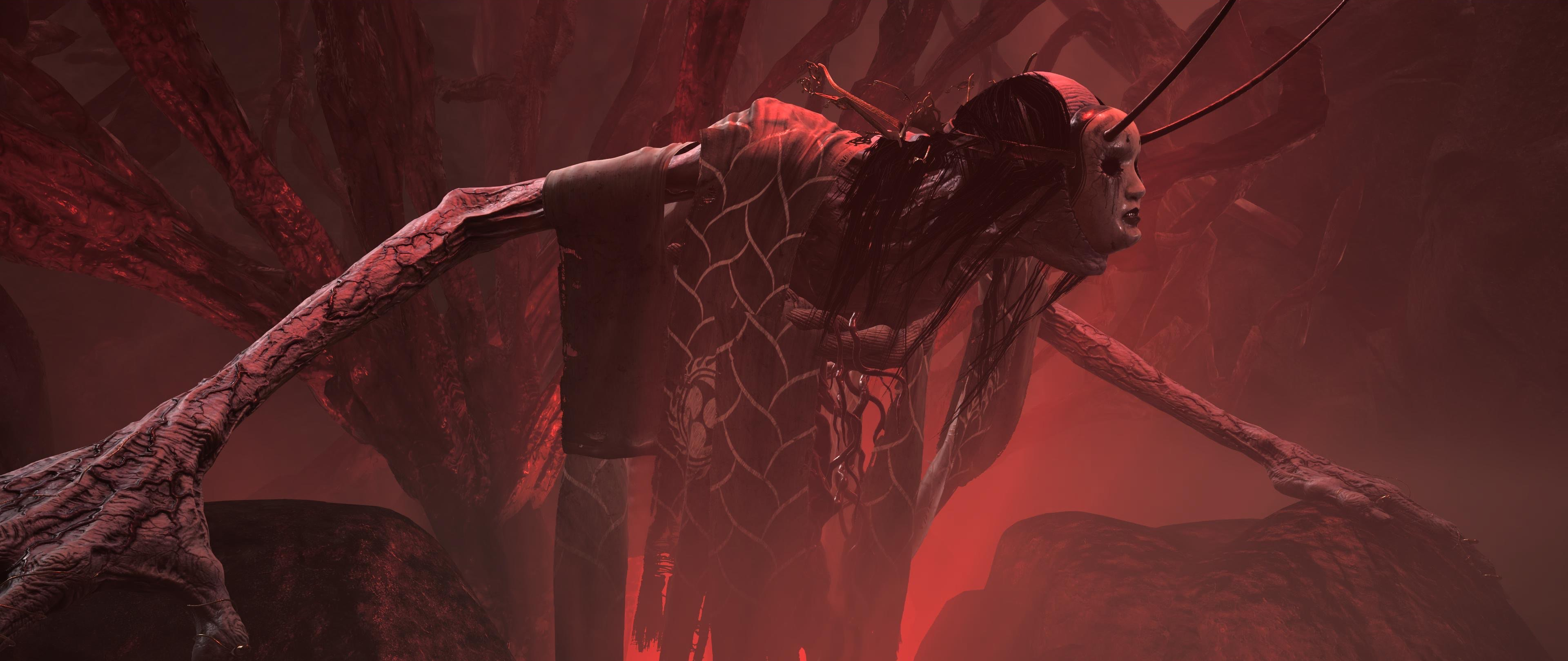 When you pass through the gate, you’ll be greeted by Iyo and she almost seems frail, but nothing less is true, and you’ll soon be greeted by her puppet, or is it Iyo’s true form? In the arena you’ll find an obelisk and spots where enemies are absorbed. There are also button’s higher up on the left and right. In the sky you’ll find 2 gates, wonder where those lead to…
